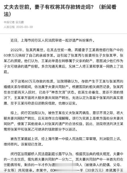 2022年,张某丙离世。在其去世前一晚,再婚妻子王某将他银行账户中的60余万元转给了自己的亲戚李某。这引起了张某丙与前妻所生子女张某甲、张某乙的质疑。法院认为,被告王某在丈夫张某丙病危、意识不清之际,将大额夫妻共同财产转出,且无法作出合理解释。该行为实质上是单方面处分夫妻共同财产,侵害了其他继承人对张某丙遗产的合法权益。因此,法院依法判决王某需将张某甲和张某乙可继承的钱款部分予以返还。(人民日报)